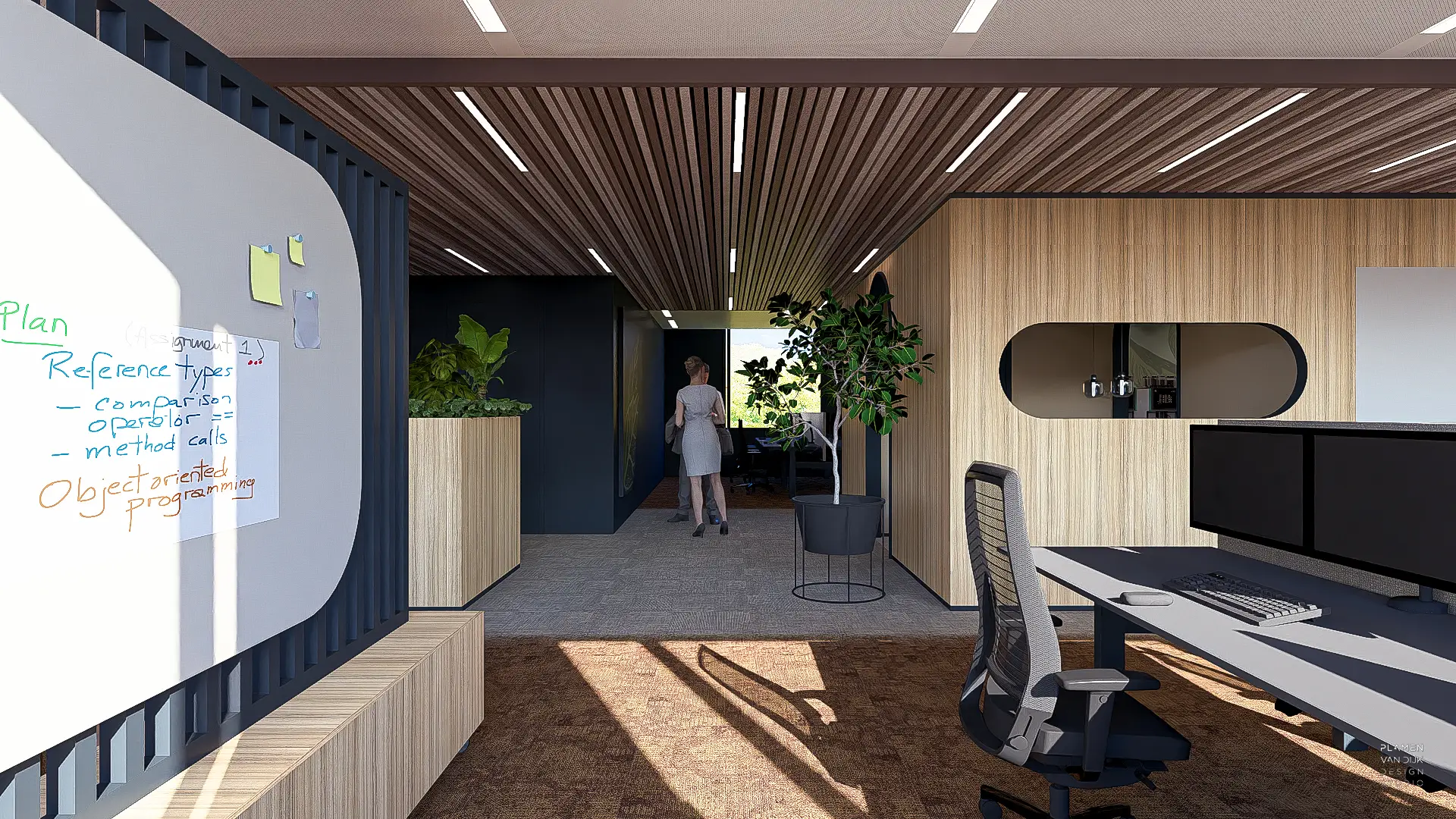 Het ontwerp richt zich op het creëren van een efficiënte en inspirerende werkomgeving waarin medewerkers zich comfortabel en productief voelen. Open werkplekken worden gecombineerd met afgesloten vergaderruimtes en zones voor concentratie, waardoor een dynamisch geheel ontstaat dat samenwerking én focus ondersteunt. Door de toepassing van duurzame materialen en moderne kleuraccenten kreeg het kantoor een frisse, toekomstbestendige uitstraling.